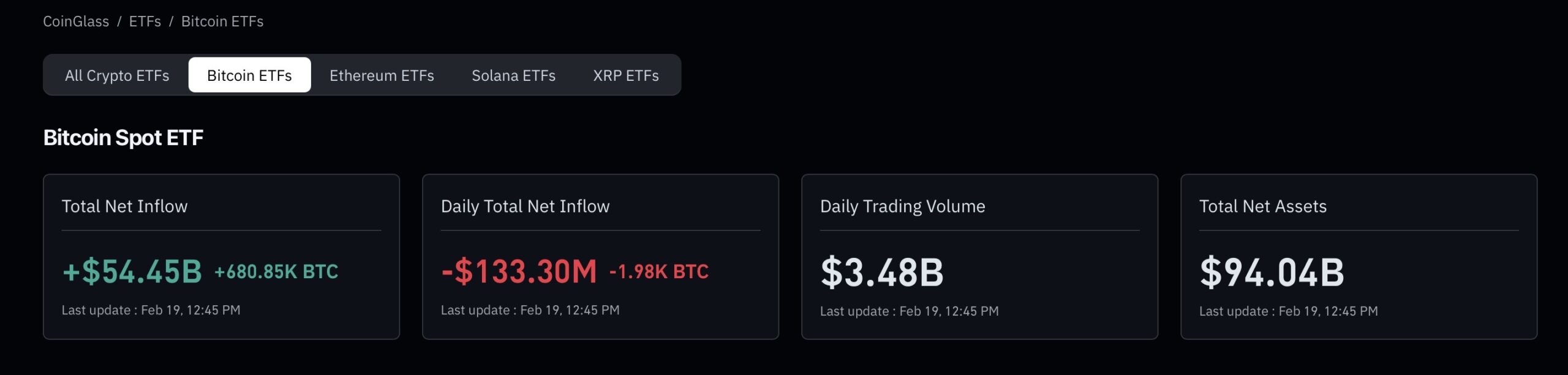 U.S.-listed spot crypto exchange-traded funds (ETFs) registered widespread outflows, with Bitcoin and Ethereum products leading the declines. By Brenda Ngari Published February 19, 2026 12:33 UTC (6h ago) |